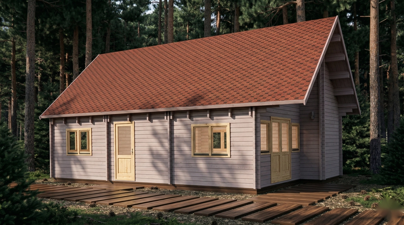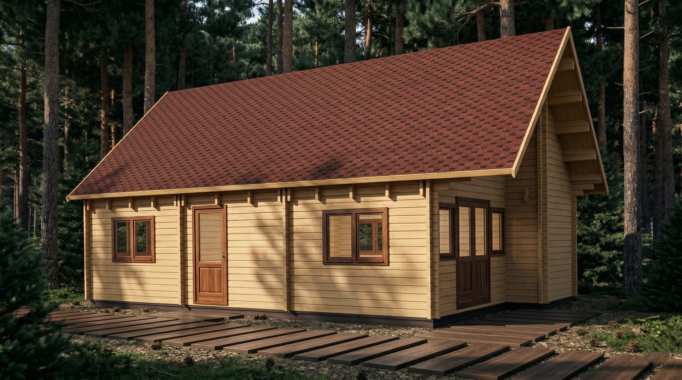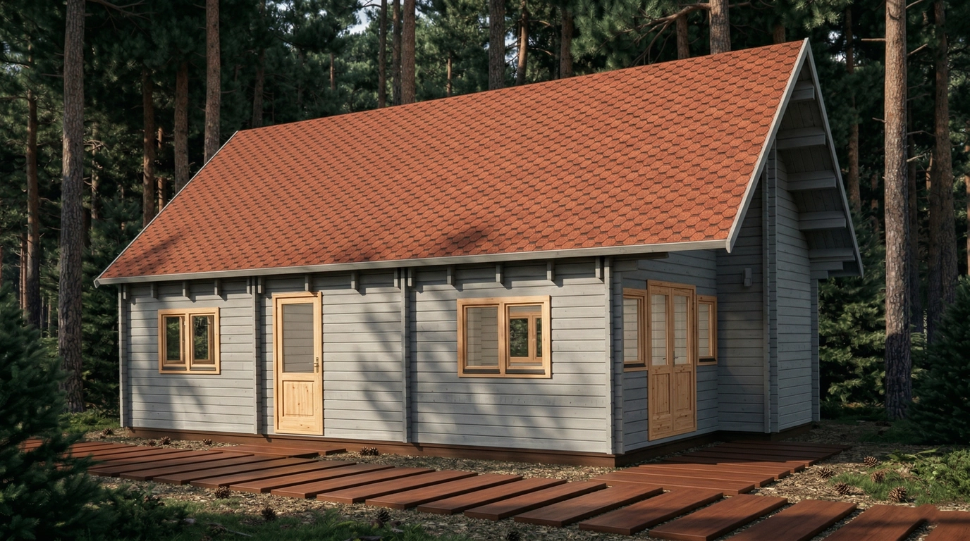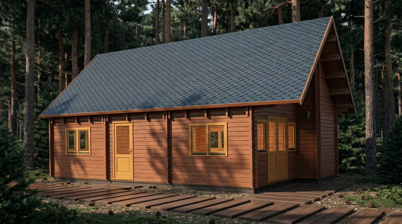 The roof is meticulously crafted with 19 durable boards, covering a total area of 92.9 m², with a 0.7-meter overhang to protect walls and foundation. External wall surfaces measure 92 m², ensuring solid construction and thermal efficiency. The 28 mm thick floorboards provide stability and comfort underfoot. Doors and windows are strategically placed for optimal access and natural light, featuring both single and double configurations with quality glazing.