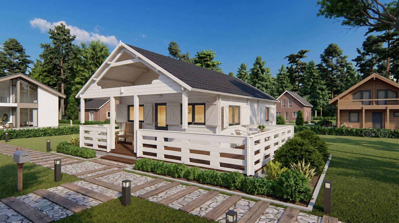 A defining detail of this summer house is the inclusion of shutters. Not only do they enhance the overall aesthetic by adding a charming, traditional touch, but they also improve privacy and light control. These shutters can help protect the interior from harsh sunlight, reduce heat gain, and add an extra layer of security.