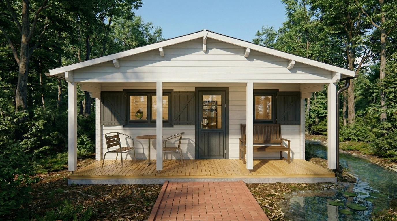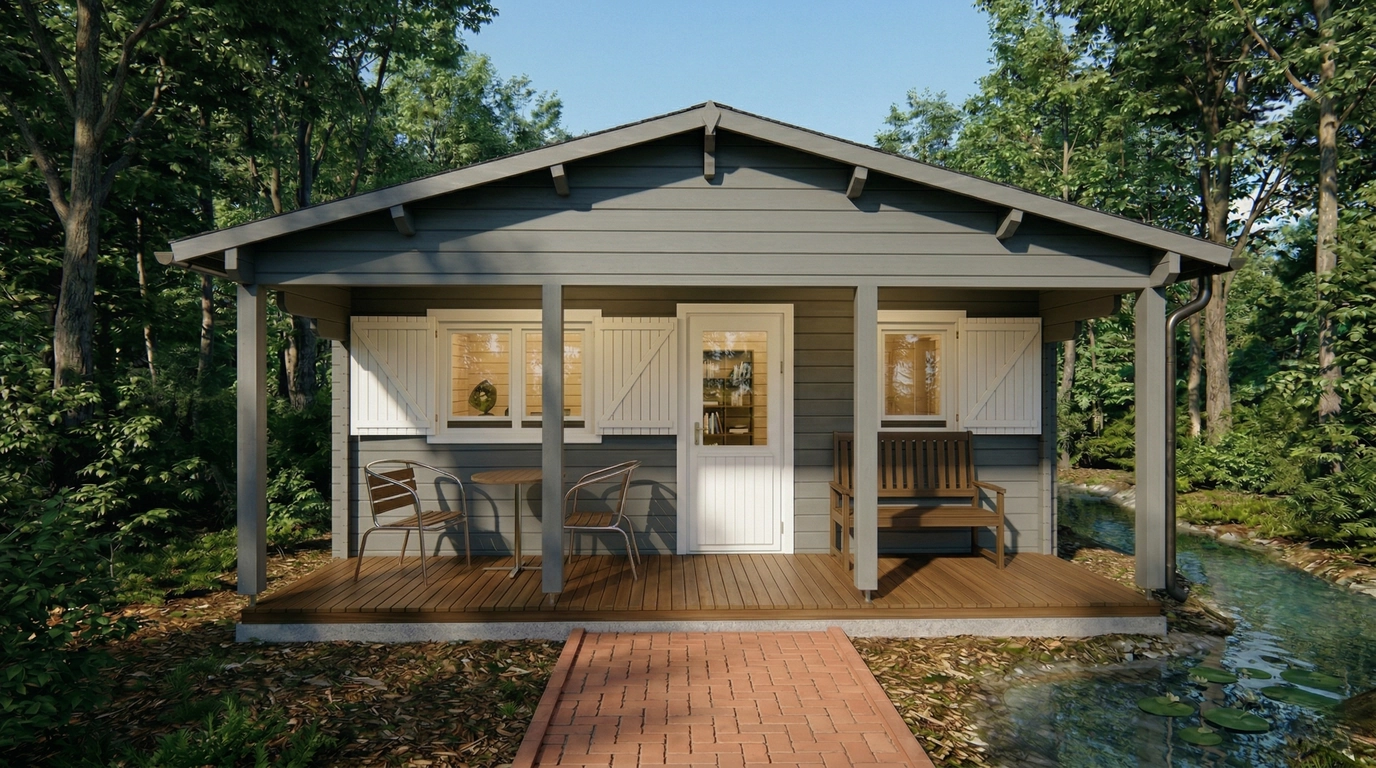 This summer house is ideal for those seeking a balance between relaxation, productivity, and style in a multifunctional garden structure.