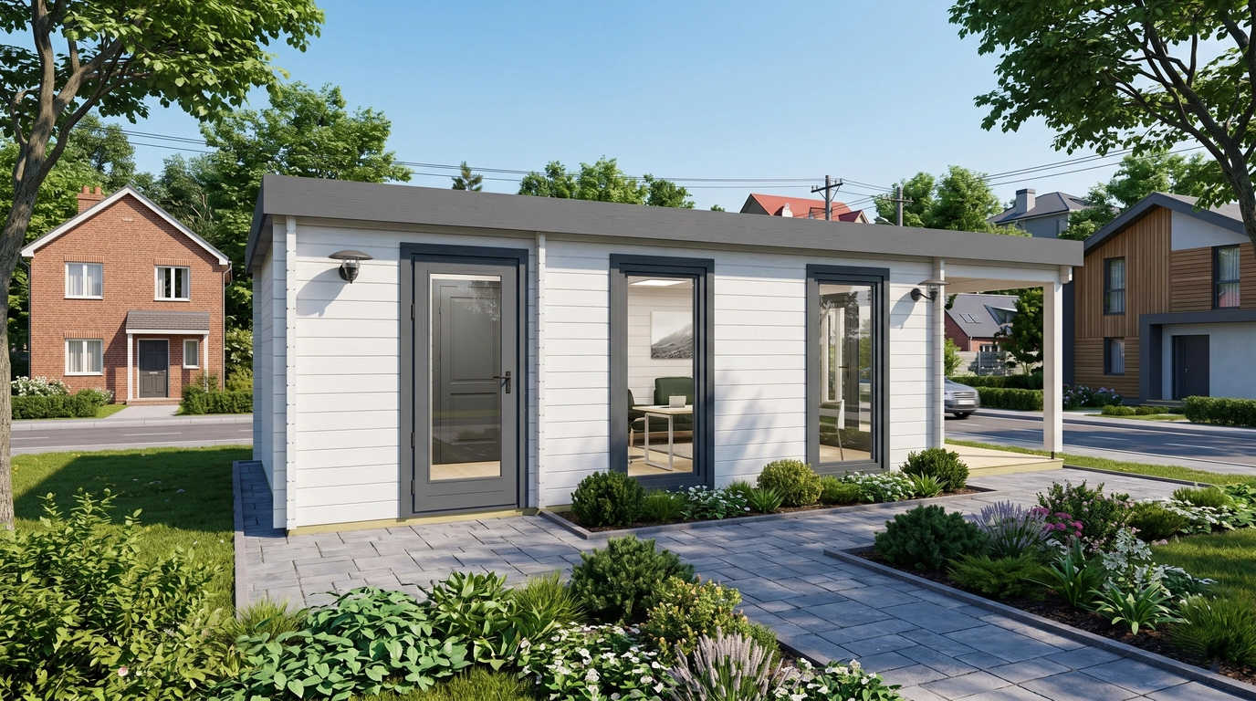 The terrace area expands the functionality of the Rico garden house, allowing for outdoor dining, social gatherings, or simply relaxing in a shaded space. Its contemporary design and glass doors maximize light and views, making the garden house a bright, inviting space in any backyard.