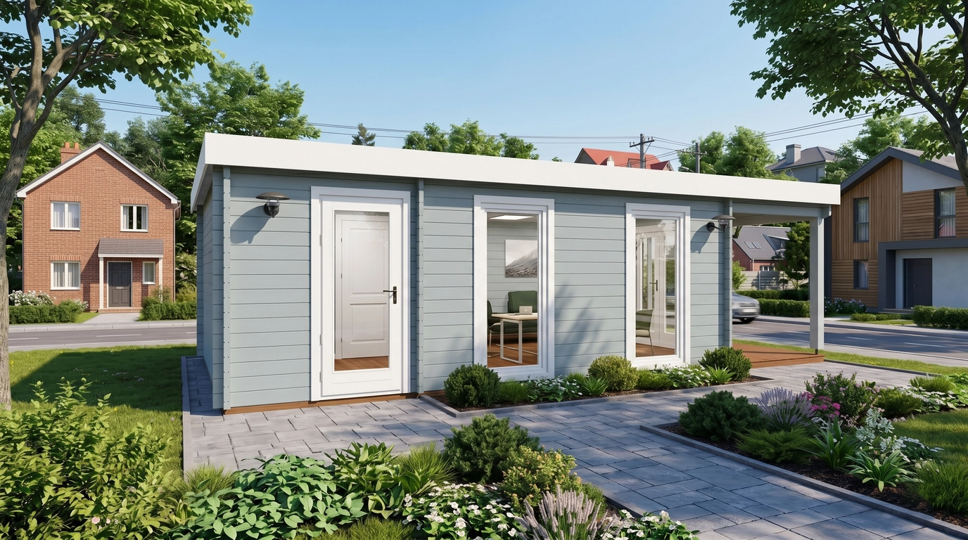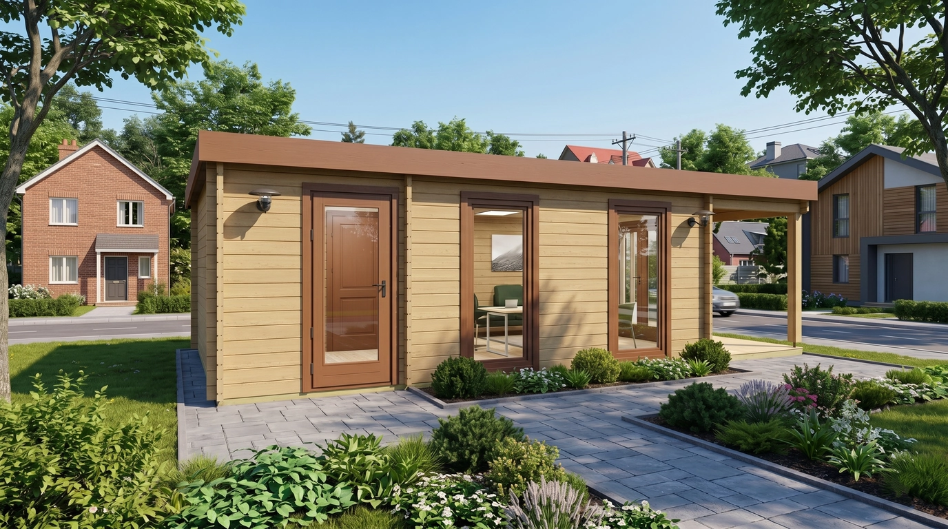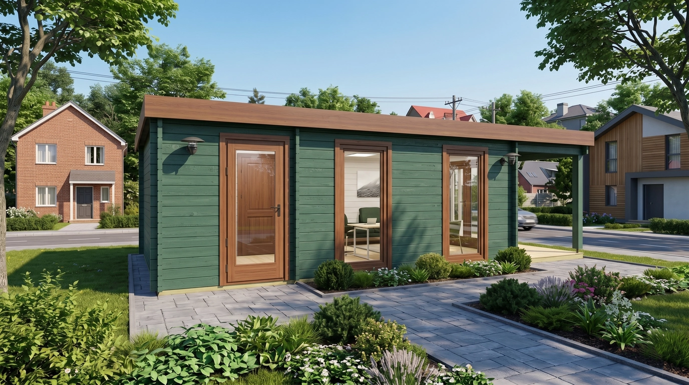 The compact yet functional design allows homeowners to maximize limited garden space while still enjoying a comfortable, practical outdoor structure. The terrace provides additional outdoor living space, perfect for small gatherings or private leisure time.