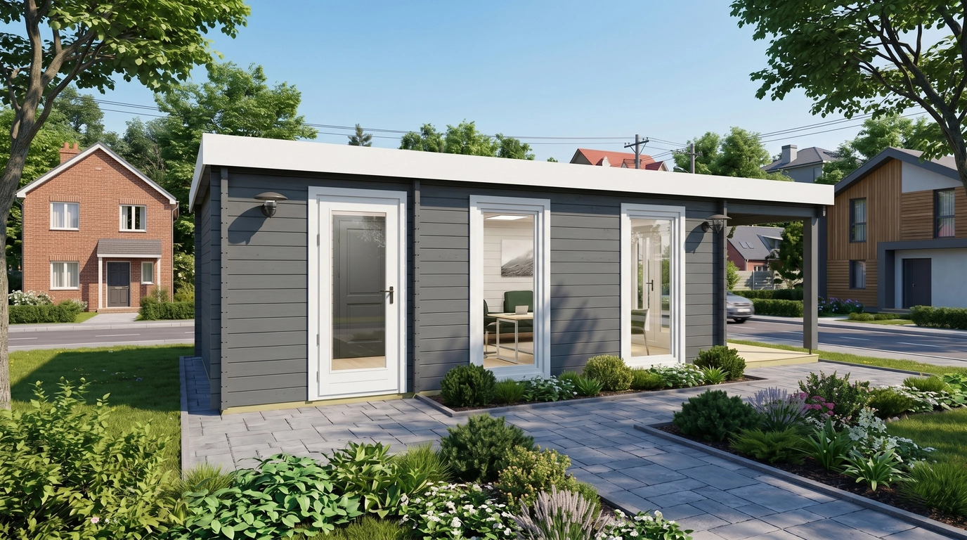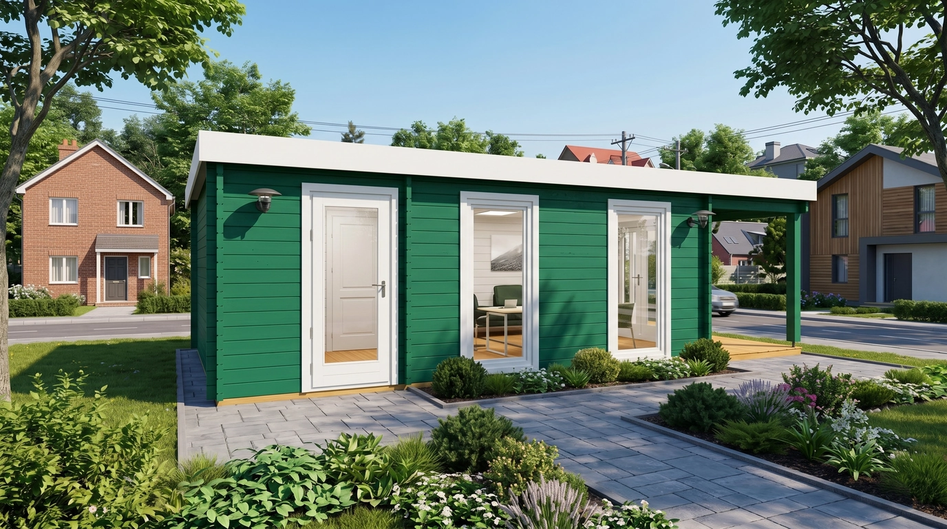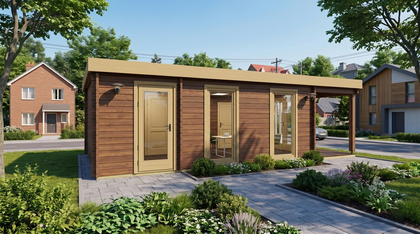 The compact yet functional design allows homeowners to maximize limited garden space while still enjoying a comfortable, practical outdoor structure. The terrace provides additional outdoor living space, perfect for small gatherings or private leisure time.
