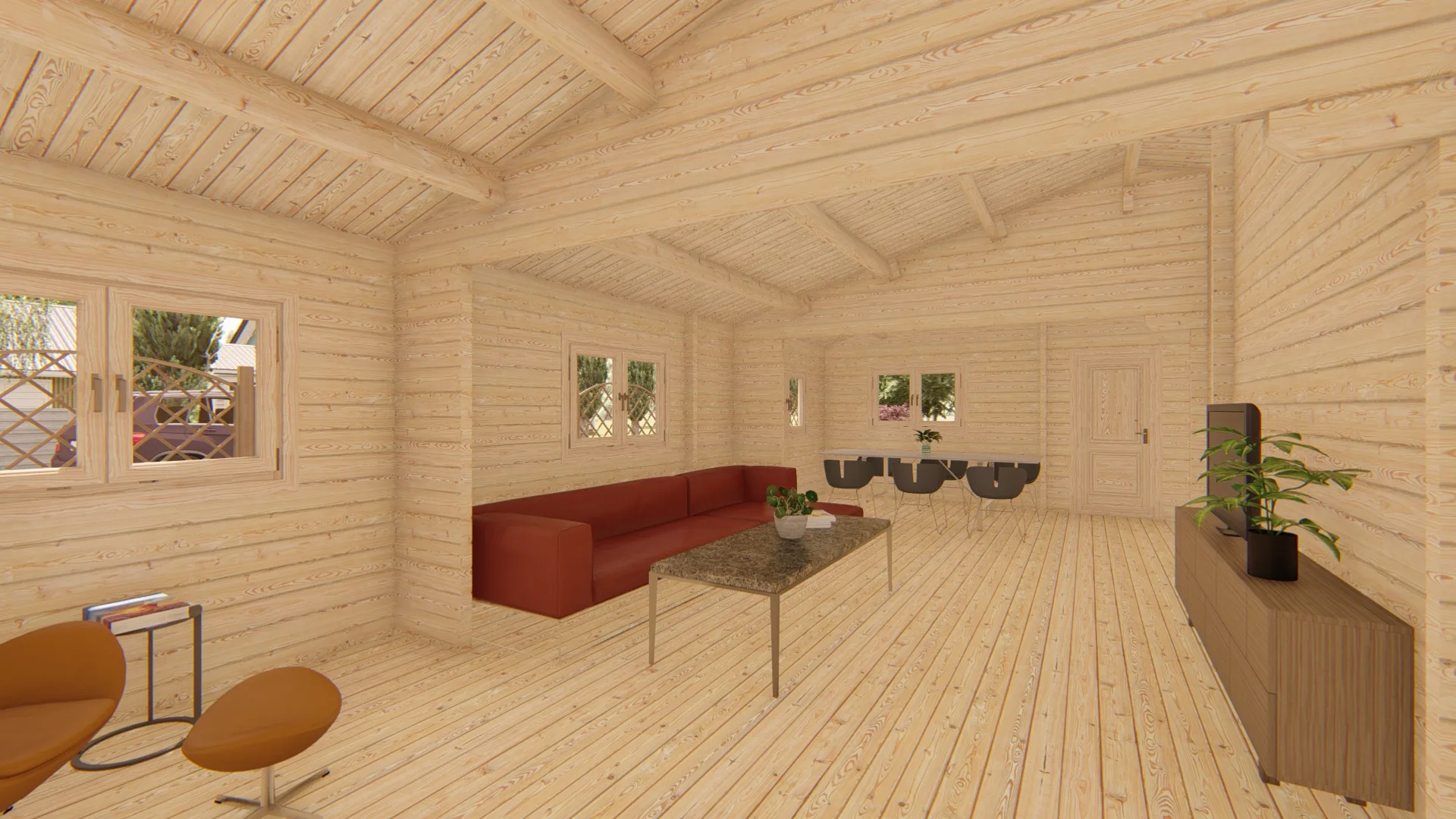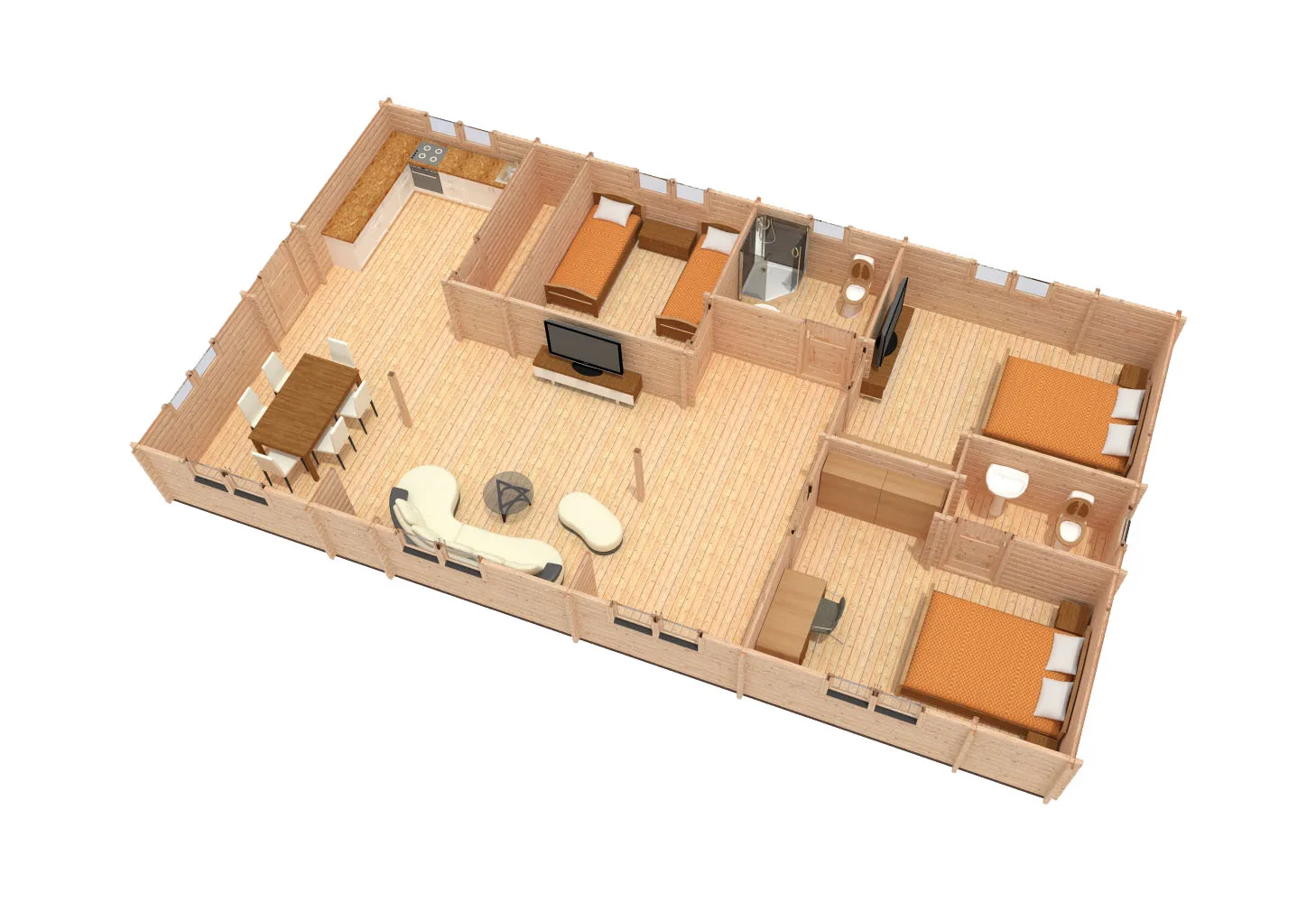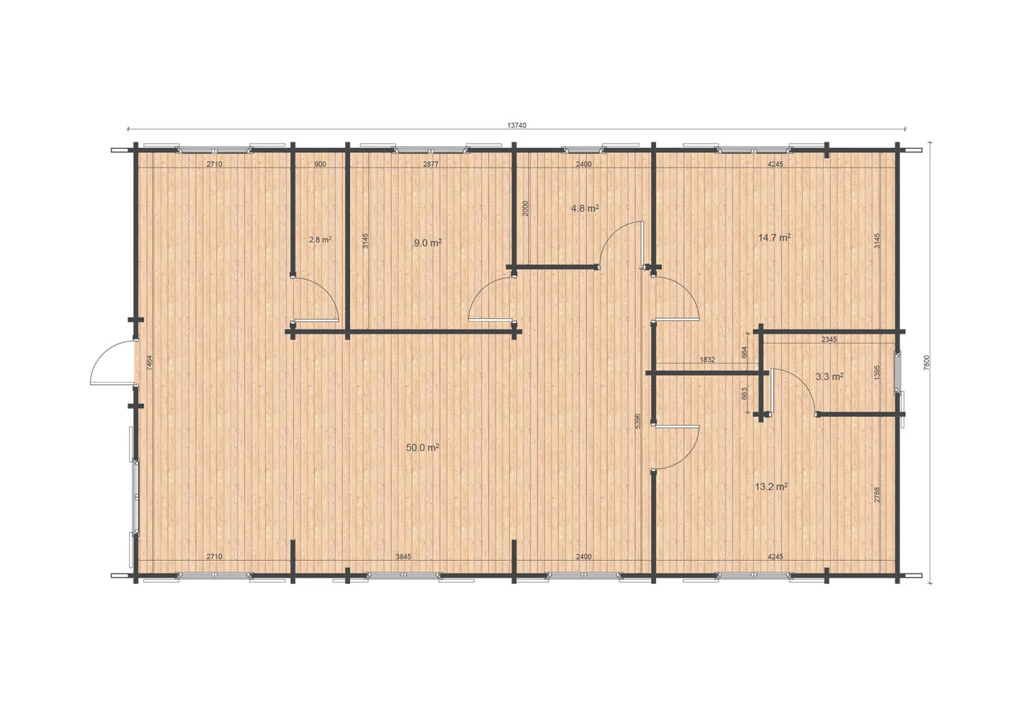 The Sevilla 7.8×13.74 m country house is highly versatile, suitable for a range of applications. Its seven-room layout allows you to designate spaces for bedrooms, living areas, kitchens, home offices, or hobby rooms.